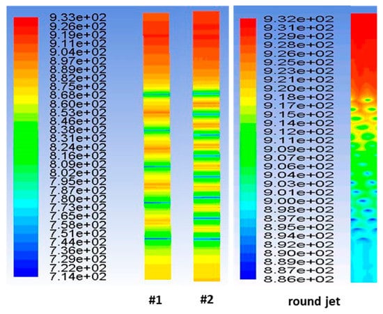 The results obtained from the simulations show that the lowest temperature at the tape outlet is found with eight slot jets. In fact, in this case a higher average convective heat transfer coefficient is obtained over the entire band surface with respect to the other configurations. The heat transfer coefficient has been evaluated according to Equation (2), with the radiant heat flux subtracted from the overall. On the other hand, the round jets configuration gives the maximum value of the heat transfer coefficient on the target surface only. As previously discussed, slot jets offer better results for higher jet-wall distances. A larger temperature gradient is found in the external parts of the impingement plane, while the differences between the distributions of Figure 23 are negligible.