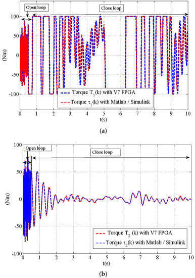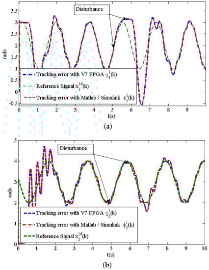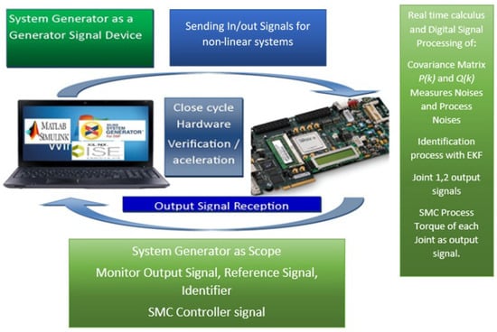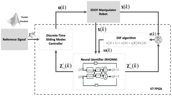 The real-time implementation of the proposed system is presented in Figure 3. The reference signal and the 2DOF manipulator robot model were realized in Matlab. The neural identifier based on the RHONN architecture, the EKF algorithm for the training, and the controller based on the discrete time sliding modes were implemented in a hardware-in-loop architecture using in the Evaluation Board Virtex 7 FPGA with an internal data acquisition device.
