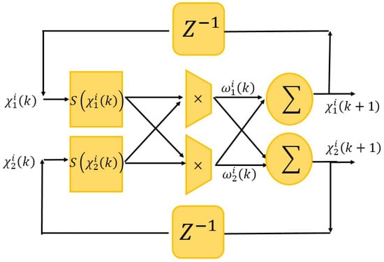 where is the neural network state, , and are the synaptic weights calculated online by the EKF algorithm, is the sigmoidal activation function, is the l-th input signal, k is the discrete time step, l-th are the states of the NN, and y is the output of the RHONN []. The RHONN architecture used to identify the 2DOF system model, described by Equation (4), is presented in Figure 2. The RHONN is composed of two neurons and one layer; the high order is due to the second-order multiplication between the two states of the system. The potential of this RHONN is centered in the EKF algorithm with the covariance matrix explained in Section 3.2.