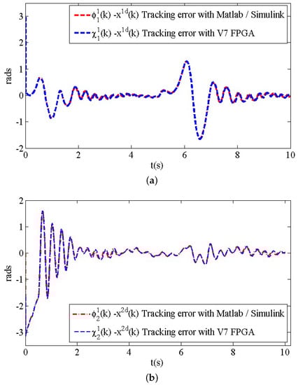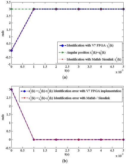 The identification results are presented in Figure 5a for the first plant state of joint 1, where the identification process used the hardware-in-loop architecture with the FPGA and the real angular position for the first joint. Please note that in Figure 5a the initial condition for the neural identifier is 0. Then, in one step simulation time, the signal of the neural identifier estimates the angular position for the first joint with very good precision. Figure 5b displays the identification error for the first state of joint 1, where is the error obtained with the FPGA hardware-in-loop architecture. For simplicity, only the identification of the first state of joint 1 is presented.