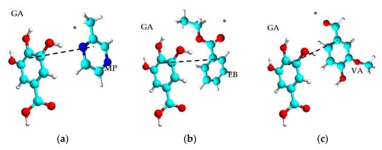 Proposed mechanisms illustrating π–π stacking interactions (black dotted line) and hydrogen bonding (* suggested involved atom) of the galloyl ring of the phenolic compound with the aromatic ring of the odorant molecule: (a) gallic acid (GA) and 2-methylpyrazine (MP); (b) gallic acid and ethyl benzoate (EB); (c) gallic acid and vanillin (VA) (adapted from Jung and co-workers [52]; created with ACD Labs, Freeware, 2020).