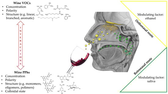 Wine VOCs–PPhs interactions and their effects on aromas release, headspace partitioning, and sensory perception represent an actual research topic in oenology. Even if some molecular insights at the base of these interactions (π–π interaction and hydrogen bonding) and the importance of VOCs and PPhs hydrophobicity have been proposed around 20 years ago, the mechanisms and the effects of these interactions are still unclear. Results of studies conducted using a variety of methods, detection modes, solutions or wines, tannin additions, or manipulation of VOC concentrations have been seen to be very different, contradictory, or difficult to interpret Moreover, results from orthonasal and retronasal studies show different behaviors, suggesting that oral factors, such as saliva, can affect the interactions.
