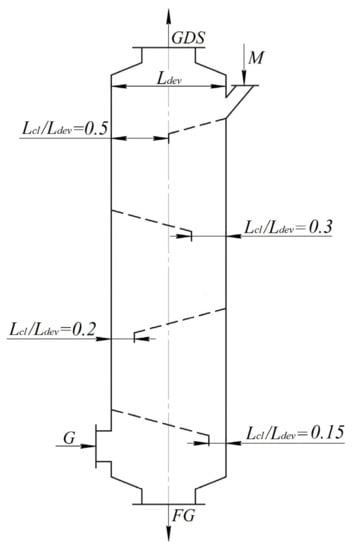 where Lcl is the distance between the end of the shelf and the wall of the device, m; Ldev is the length of the cross-section side in the device, m; ψ is the perforation degree of the shelf, %; Wcrit—critical velocity of the initial weighing, m/s; dp is the average diameter of particles being weighed, m; ν is the kinematic coefficient of the gas flow viscosity, m2/s; Reo.s.—Reynolds criterion in conditions of particle hovering in a gas flow; Reo.s. = Wo.s. dp/ν; Wo.s.—medium velocity in conditions of particle hovering, m/s.