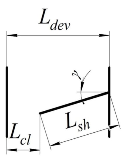 Shelf contact elements differ from gas distribution grids of fluidized-bed devices and wedge-shaped elements plates primarily due to the presence of outloading space between the end of the shelf and the wall in the unit (Figure 1). The width of the outloading space is expressed by the ratio Lcl/Ldev, where Lcl is the distance between the end of the shelf and the wall of the device, and Ldev is the length of the side section of the device. It is possible to influence the gas flow distribution between the outloading space and the holes of the shelf, as well as on the ascending flow velocities in the separation space and the solid phase, moving along the shelf, by varying the Lcl/Ldev ratio, the perforation degree of the shelf ψ. The tilt angle of the shelf γ to a lesser extent affects the velocities profile of the gas flows over the outloading space and the holes of the shelf. The optimal tilt angle of the shelves is γ = 25° to the horizontal plane (Figure 2). The material particles lay on the surface of the shelf at a smaller angle. The particles quickly roll down to the outloading space and do not form a weighted layer above the shelf at a larger angle. The distance between the end of the upper shelf and the beginning of the lower shelf Ls is determined by the ratio between this distance to the length of the lateral part of the section in the device—Ls/Ldev. If Ls/Ldev < 0.5, the gas flow velocity in the outloading space increases. As a result, the free flow of material particles is impeded through the outloading space to the lower shelf. As the distance Ls increases, the gas flow velocity in the outloading space naturally decreases. When Ls = Ldev the flow rate is constant. Therefore, we take 0.5 < Ls/Ldev ≤ 1 in the construction of the device.