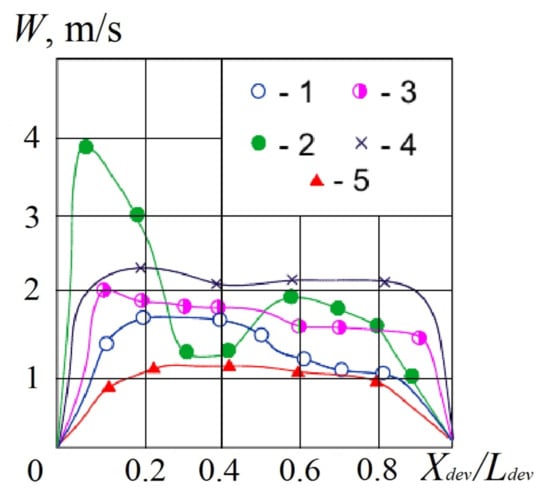 As a result of the free cross-section narrowing of the vertical channel, the inclined perforated shelf installation in the workspace of the shelf device causes a local increase in the velocity and turbulence of the gas flow in the outloading space and a change in the profile of gas flow velocities under the surface of the shelf and above it. As can be seen from Figure 4 (curves 1 and 2), a decrease in the value of the Lcl/Ldev ratio from 0.5 to 0.15 significantly increases the uneven distribution of the gas flow over the section of the workspace in the device in comparison with the installation of the perforated grid completely overlying the section of the workspace in the device (an analogue of the fluidized bed device (Figure 4, curve 4)), or the free channel (a pneumatic tube device (Figure 4, curve 5)). In this case, the width of the zone where the gas flow comes through the outloading space decreases, its absolute velocity and the profile of gas flow velocities in the workspace of the device is changed.