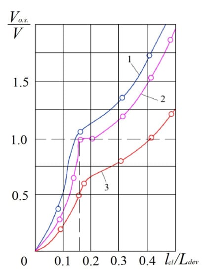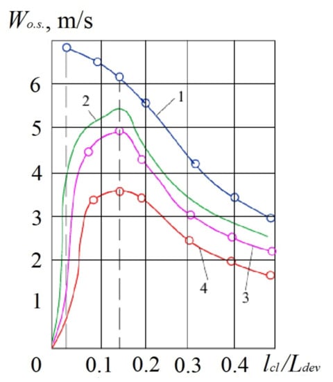 A comparison of the experimental (Figure 4) and theoretical velocity profiles (Figure 3) shows a sufficient coincidence between the nature of the gas flow velocities change along the cross-section of the workspace in the device. The absolute value of the gas flow velocity in the outloading space with a decrease in the Lcl/Ldev ratio from 0.5 to 0.3 grows insignificantly for a shelf with a perforation degree from 0% to 30% (Figure 5).