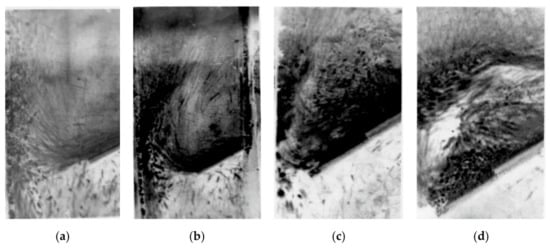 Photographic image of hydrodynamic modes: (a) “gravitationally falling layer” mode; (b) “transitional” mode; (c) “weighted layer” mode; (d) “piston” mode.
