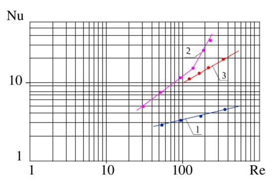 The influence of the gas flow velocity on the interphase heat transfer process intensity is represented by the dependence Nu = f (Re) (Figure 8).