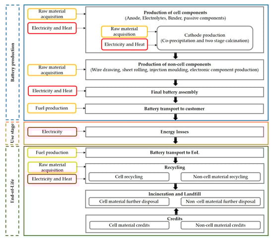 The environmental impacts of different battery types and chemistries are generally analysed using a Life Cycle Assessment (LCA) [10]. In fact, a complete LCA is comprehensive of all the life cycle stages that characterise a product. Many studies [9,11,12,18,19,20,21,22] have assessed the impacts of the production stage of NMC batteries, but they have not covered the other life cycle stages, and have often been neglected the End-of-Life (EoL) and Use stages.