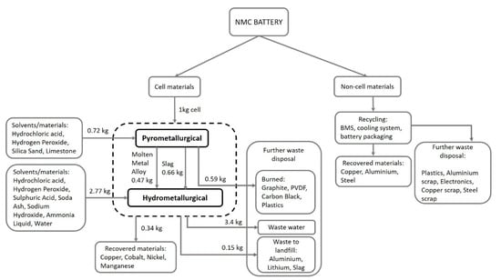 - The recycling phase of the battery components has been analysed, as recommended in the PEFCR on batteries [26], i.e., by modelling the Pyrometallurgic and Hydrometallurgical recycling processes in cascade. These two processes are usually presented in the literature as alternative options for the recycling phase.