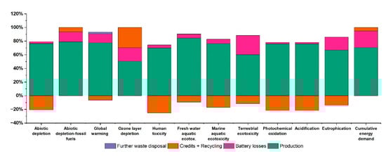 The impact of the EoL stage on both the cell materials and the non-cell materials was divided into three parts: Recycling (impact of the recycling process), Credits (savings obtained by replacing part of the virgin materials with recovered ones), and Further waste disposal (impacts necessary to complete the disposal of nonrecycled materials). It was assumed that the EoL phase occurred in Europe, and the average European electricity mix was therefore used.