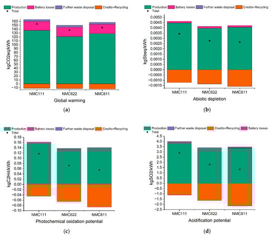 As far as the End-of-Life (EoL) stage is concerned, the actual low recycling rates for LIB could lead to a loss in the environmental benefits inherent to this type of battery. Moreover, the great uncertainties associated with the use of certain materials (e.g., solvents) and energy in the recycling processes, due to the lack of industry data [10], have led many researchers to neglect the EoL stage. The impact of the EoL stage of NMC batteries has been found to only have been studied in a few works [23,24,25], in which three recycling processes were considered as alternatives (Pyrometallurgic, Hydrometallurgical and Direct) and in PEFCR [26], in which only one Pyrometallurgic-Hydrometallurgical cascade process was considered for a generic Li-ion battery.