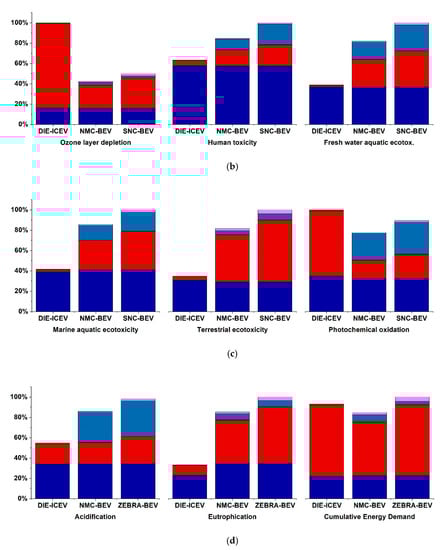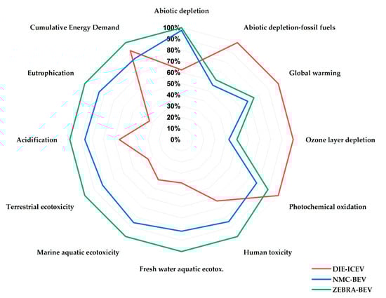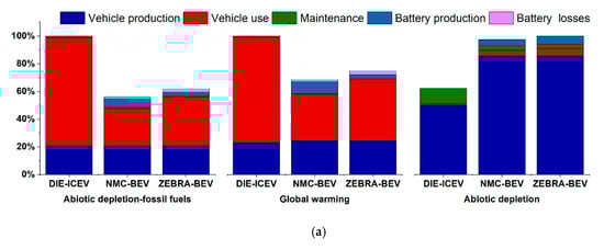 Finally, these two electric BEVs have been compared with the same LDCV equipped with a diesel ICE powertrain (DIE-ICEV) in order to evaluate the potential benefits achievable with the electrification of the vehicle. It is worth recalling that diesel ICE and ZEBRA battery electric vehicles had already been analysed in a previous paper by the authors [35]. The previous analysis has been updated to Ecoinvent version 3.6 for the present study.