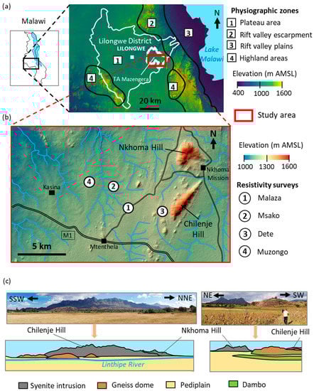 The study area is located in the extensive Proterozoic Basement Complex. Two main geological settings are distinguished in Malawi (Supplementary Materials Figure S1): zones where the Basement Complex is at surface, most of the study area; and zones where it is covered by colluvium or alluvium, occurring in the west of the study area [] (Figure 2). Lithologies of the Basement Complex comprise: (i) medium- to high-grade metamorphic rocks (mainly felsic gneiss and granulites) which underwent foliation, folding, migmatisation and diapiric crustal flow, the latter being visible at the surface, in the form of short, soft hills corresponding to the outcropped portions of gneiss domes; and, (ii) syenite intrusions visible at surface as the tall, sharp hills of Nkhoma and Chilenje (Figure 1c) [,,,,,]. Metamorphic terrains of the Basement are attributed to tectonic and metamorphic activities of Proterozoic orogenies [,]. Strikes, foliations, elongated gneiss domes and lineaments display a general SSW–NNE orientation [,], but without obvious influence of the Early Miocene to Quaternary East African Rifting []. Four erosion surfaces were identified: Gondwana (Jurassic) and post-Gondwana (Early and Mid-Cretaceous) erosion surfaces, remnants of which could be the hills of Chilenje and Nkhoma; a Late Cretaceous to Early Miocene African erosion surface corresponding to the pediplanation responsible for the current general aspect of the plateau; and a later Miocene to Pliocene post-African erosion surface corresponding to the dissection of the plateau in the major river valleys [,].