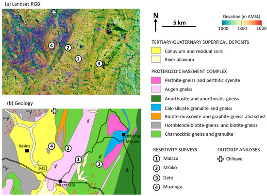 Location of resistivity survey demonstration area shown relative to (a) Landsat image [] and (b) the geological setting (digitized, adapted and reinterpreted from Hughes and Matumbi []). Landsat imagery courtesy of NASA Goddard Space Flight Center and US Geological Survey.