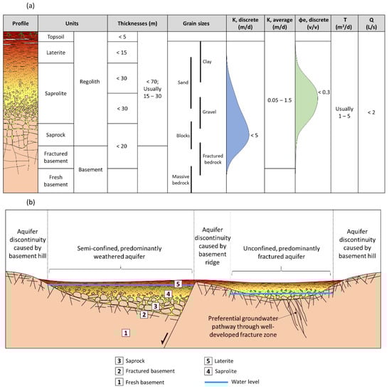 (a) Typical vertical profile of fractured/weathered basement aquifers in tropical environments. (b) Examples of aquifer subtypes among fractured/weathered basement aquifers in tropical environments.