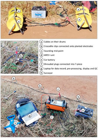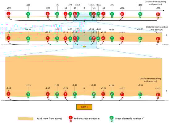 A collinear 18-electrode array layout was used with a symmetrical cable arrangement of 9 single-conductor cables on either side of the sounding mid-point (electrodes and conductors numbered 1 to 9 and 1’ to 9’ on opposing sides). Two slightly different electrode layouts were used successively to acquire a “red series” and “green series” of individual resistivity measurements subsequently combined to give one sounding. A maximum electrode distance from the mid-point of 200 m was selected to provide a depth of investigation (DOI) of around 80 m with a Wenner, Schlumberger or Wenner–Schlumberger array []. Electrode distance from the mid-point was set to increase (quasi) exponentially, away from the mid-point, to allow for exponential decrease in resolution with depth: 0.78, 1.57, 3.13, 6.25, 12.5, 25, 50, 100 and 200 m for the red layout; 0.39, 1.18, 2.35, 4.69, 9.38, 18.75, 37.5, 75 and 150 m for the green layout (Figure 4). The cable system was built by the lead author, with the assistance of an electronics technician. Component cost for the cable system amounted to (GBP) £350, using average-quality components. Survey equipment photographs are provided in Figure 5, with further practical construction details of the cable system in the Supplementary Materials Box S1.