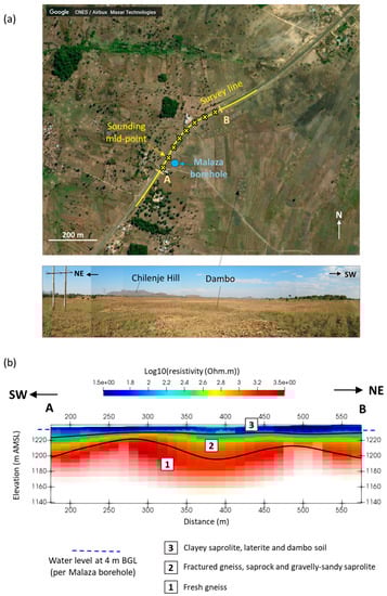 Malaza survey: (a) site survey line location (with individual sounding mid points marked as crosses) shown on a Google Earth satellite image (July 2020 download) of the area with accompanying landscape photograph; and, (b) interpreted subsurface resistivity cross-section obtain for section line AB marked on (a).