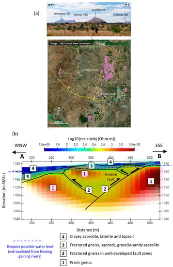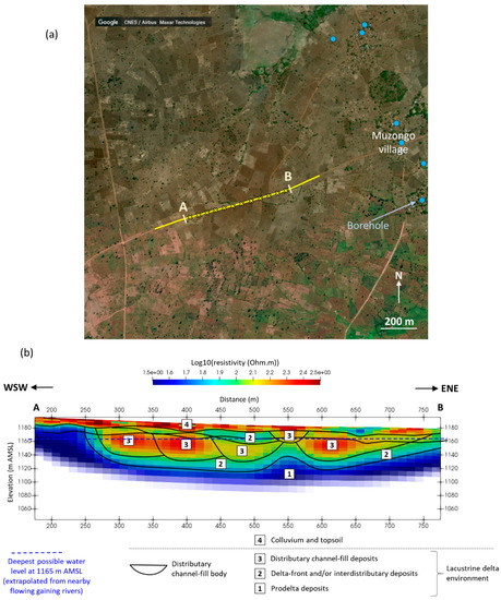 Muzongo survey: (a) site survey line location (with individual sounding mid points marked as crosses) shown on a Google Earth satellite image (July 2020 download) of the area; and, (b) interpreted subsurface resistivity cross-section obtain for section line AB marked on (a) (interpretation includes consideration of outcrop analysis (Figure 10)).