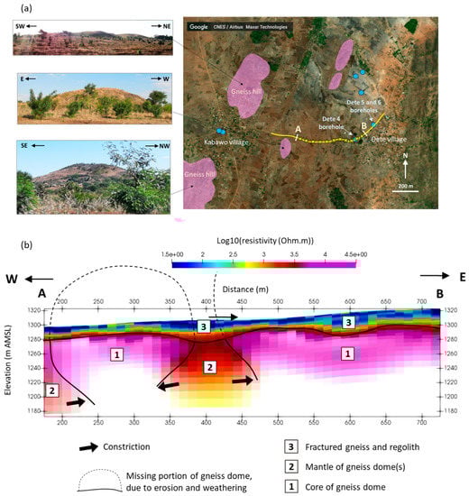 The Dete survey site is located in a zone of the Basement Complex, where charnockitic gneiss and granulite are the dominant lithologies [] (Figure 8a). The site borders the southwest of Chilenje Hill and generally slopes westwards, decreasing in gradient from the foot of Chilenje Hill in the east to a plain in the west. This slope is interrupted by bare, soft, SSW–NNE-elongated gneiss and granulite hills that display exfoliation joints. Many boulders of gneiss and granulite can be observed at surface. Dete village lies in the east and Kabawo village in the west. Three boreholes are present in Dete: Dete 4 and Dete 6, which have been abandoned due to very low yields, and Dete 5, which is being used but also has a very low yield.