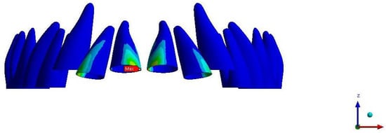 PDL stress accounted for, on average, 76.5 g/cm2, involving the mesio-buccal gingival parts of the central incisors’ roots and distal-buccal gingival parts of the lateral incisors’ roots (Figure 2).