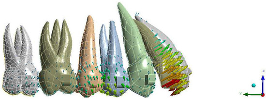 Consequently, aligner deformation was similar for all simulations. A strong tendency for buccal tipping and intrusion was observed at the molar, premolar, and canine levels, while for the incisors, a deformation of the aligners’ gingival margins away from the tooth surfaces was observed.