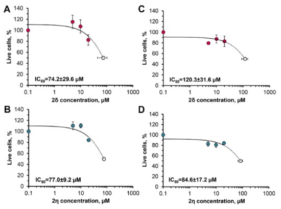 Dose-response curves of 2δ and 2η LONs for RAW264.7 (A,B) and human THP-1 induced macrophages (C,D). Cells were incubated with LONs in a complete medium for 24 h. The results are shown as a percentage of viable cells observed after cell incubation with LON relative to untreated cells (100%). All experimental points were run in triplicate for statistical analysis. Data are presented as MEAN ± SD. The dotted curve shows extrapolation to 50% of viable cells.