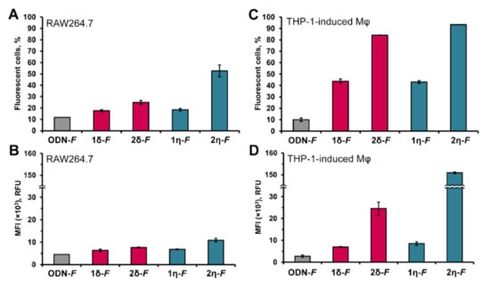 Accumulation of LONs in RAW264.7 and THP-1-induced macrophages differed considerably. LONs accumulated in RAW264.7 cells with moderate efficiency: 20–50% of cells were transfected with a MFI of 6–11 × 103 RFU (Figure 4A,B). As expected, the cells incubated and control oligonucleotide ODN-F displayed the lowest efficiency: 10% of fluorescent cells with MFI of 4 × 103 RFU, which corresponded to the baseline level of oligonucleotide taken up by the macrophages and/or adhered to the cell surface. We observed that more hydrophobic LONs, that is, the ones containing either two hydrocarbon chains instead of only one, or those having a longer aliphatic group: hexadecyl instead of dodecylphenyl, were showing more efficient accumulation in RAW264.7 cells (Figure 4A,B: compare conjugates having two vs. one group, and η- vs. δ-modified LONs) than their less hydrophobic counterparts and unmodified control ODN-F.
