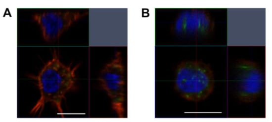 Confocal microscopic analysis was carried out to verify and characterize intracellular localization of LONs. RAW 264.7 and human THP-1-induced macrophages were incubated with 5.0 μM fluorescein-labeled LONs in complete medium for 24 h. After incubation, cells were stained with Phalloidin-iFluor532 or Phalloidin-TRITC (actin microfilaments) and NucBlue (nuclei) (Figure 5, Figure 6 and Figure 7).