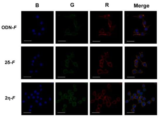 It can be seen that the efficiency of intracellular accumulation of LONs according to confocal microscopy (Figure 6 and Figure 7) correlate well with the obtained flow cytometry data (Figure 4). Oligonucleotides containing two lipophilic groups accumulated in cells with much higher efficiency in comparison with LONs containing only one group, LON 2η with two hexadecyl groups being the best penetrator. LONs 1δ-F and 1η-F containing only one lipophilic modification accumulated in cells with efficiency not significantly higher than that of the control unmodified oligonucleotide ODN-F. However, these LONs penetrated into the cells whereas ODN-F mainly adhered to the cell membrane (Figure S5, Supplementary Materials).