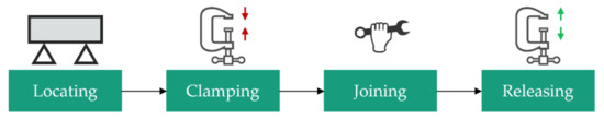 In the scope of this work, SMs for joining processes are researched. The generic joining process according to Dahlström et al. [50] consists of the four steps Locating and Placement of parts in a fixture, Clamping of the parts, Joining and Releasing from the fixture [27], as shown in Figure 3.