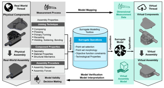 Figure 5 depicts the Surrogate Modelling process, where the real world process is linked to the virtual process domain by Model Mapping (physical to virtual thread) as well as Model Verification and Model Interpretation (virtual to physical thread). Suitable SOs are abstracted from assembly properties such as the Joining Technique, Component Properties and the Assembly Procedure. By the composition of an SM, which is deployed to the measured SMS of the parts, a virtual assembly is simulated regarding the influences of the physical assembly on the assembly’s geometrical quality. SOs determined for this work are arranged in Table A1 (cf. Appendix A), which are separated into