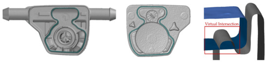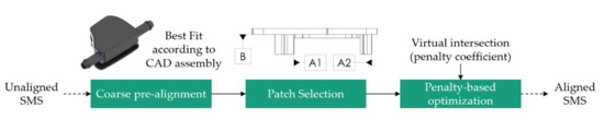 The Coarse Alignment is used in order to reduce the search distance for the point correspondence search to a feasible magnitude. By Patch Selection, the assembly sequence is considered since both parts are joined along the datums A and B. By Virtual Intersection, the joining process is simulated, where the material reservoir in the welding bead is melted during the laser welding process. These particular SMs were selected with regard to technical specifications and the assembly procedure.