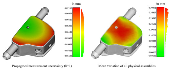The propagated uncertainty of the virtual assembly comprises the uncertainty of measurement points that arises from 20 CT scan repetitions. The uncertainty is further increased by the transformation uncertainty emerging at VA, which causes a slight variation of the determined assembly position and orientation of the point set to register for repeated registrations. The subscript “P” denotes the transformed state that is gathered by using a linear uncertainty propagation method. Here, an uncertainty coverage factor of as defined in ISO/IEC 98-3 [69] is applied. The uncertainty is shown in Figure 8 (left) and is in range of up to ca. 0.07 mm. For the transformed point set, equals to the standard deviation of the VA variation .