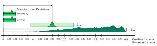 The average manufacturing deviations and of the covers and housings, respectively, are determined analogously to Equation (4) as mean deviations from the respective mean value for all 24 covers and housings. They are normally distributed (their mean values are equal to approx. 0.03 mm) and are about ten times smaller than the mean variation of all physical assemblies (up to max. 0.4 mm). Values for are shown in Figure 8 (right). Thus in a first approximation, the influence of the manufacturing deviations on assembly variations is neglected, because they contribute to less than 10% of the extent of the variation of all physical assemblies .