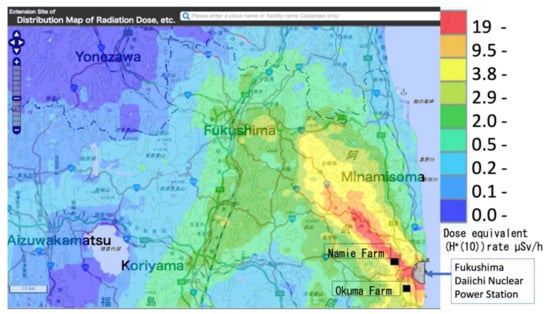 Radiation dose-rate map obtained by airborne monitoring results and the location of Okuma and Namie Farm as of 31 May 2012. This map was quoted from the website provided by Nuclear Regulation Authority, Japan. Dose rate shows μSv/h as a dose equivalent rate including background radiation. (http://ramap.jaea.go.jp/map/). Note: H*(10) means ambient dose equivalent.
