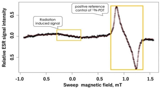 Note: The measurement conditions include 200 scans. Scan conditions are shown in the text. The Scheme 0.2 mT showed a positive reference of 15N-PDT. The estimated dose for this sample was 2.3 Gy.