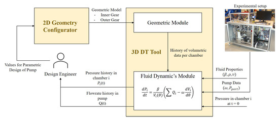 For our Digital Twin (DT) implementation, we have defined a three step workflow: (i) the design engineer inputs the values for the parameterization of pump design into the Geometry Configurator, (ii) the geometric model of the pump (inner and outer gears) is generated, and (iii) the virtual prototype performs the fast simulation of the pump with the geometric data and experimental data being measured from the test bench (see Figure 2). Please see the Abbreviations section immediately before the References section to find the meaning for the symbols used.