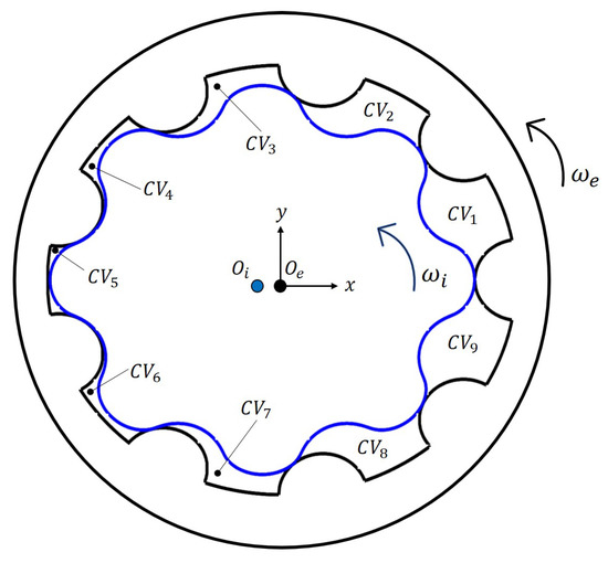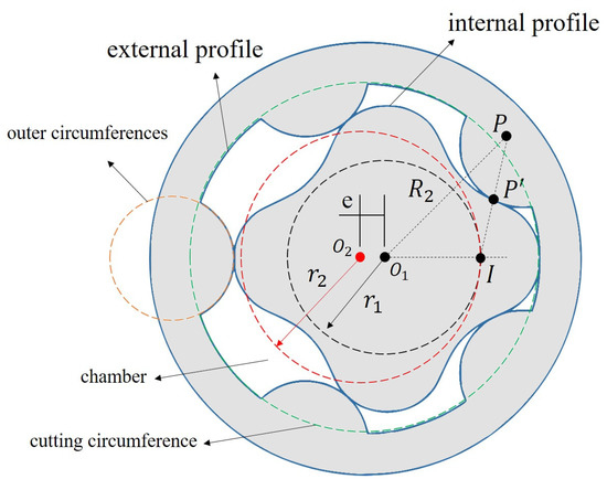 where the parameter corresponds to the turning angle of the rotor. Figure 4 shows the resulting shape of the internal profile as the trace of contact point , whose position is determined by the radii and , the eccentricity e, and the number of chambers Z. In Figure 4, the external profile is determined by a set of outer circumferences that are truncated by a larger cutting circumference.