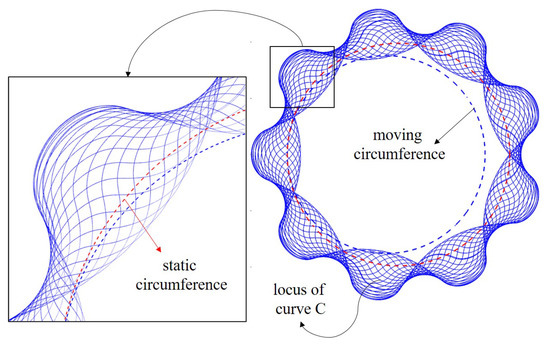 Suppose the curve C that corresponds to the internal profile (Equations (1) and (2)) is put through a series of affine transformations that are defined by the rolling without slipping of the circumference defined by with respect to the circumference defined by in Figure 4. Subsequently, the external profile shape will be defined as the envelope curve of the locus of C as it moves through the rotation domain.