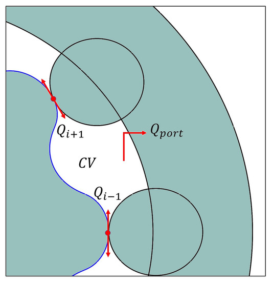 We omit the derivation of such an expression, since it is beyond the scope of our paper, the interested reader can find a thorough explanation in Ref. [11]. The net flowrate that flows through the boundary of a control volume needs to be calculated in order to integrate Equation (4), and since the volume and volume derivative at angle are provided by the geometric module. We consider two types of flows through the boundary of a control volume (Figure 7):