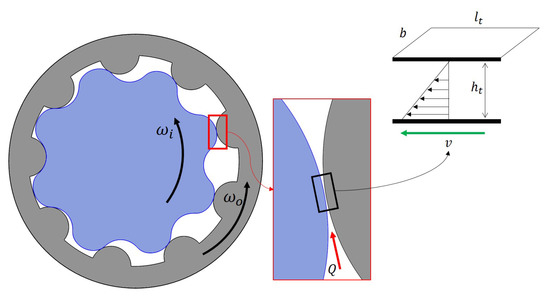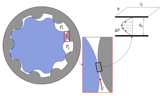 where is the maximum discharge coefficient and is the critical Reynolds number, which indicates the transition between laminar and turbulent regime. Values for constants and can be found in the literature as a function of conditions of the pump [8]. This flow between adjacent control volumes that should be nominally tight is enabled by the small gap between the rotors at their maximal approximation position. These gaps are necessary for ensuring rotation and limit friction and wear. The resulting fluid migration between adjacent chambers is caused by: