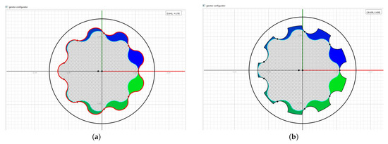 Figure 10 shows the visualization of the parameterized pump in the interface of the 2D geometry configurator tool. The tool allows for the design engineer to input the desired set of values for the parametric variables of Equation (2). Our application automatically generates both the conjugated design (Figure 10a) and the classic design (Figure 10b). Both types of design, as well as other geometric configurations, are easily explorable in the 2D visualization canvas.