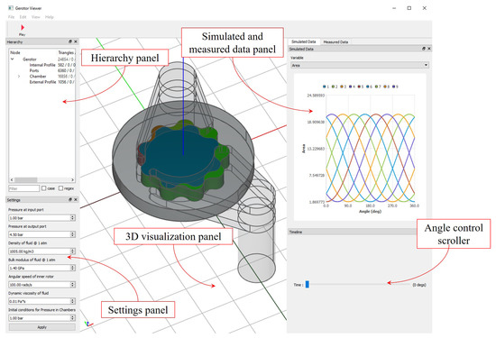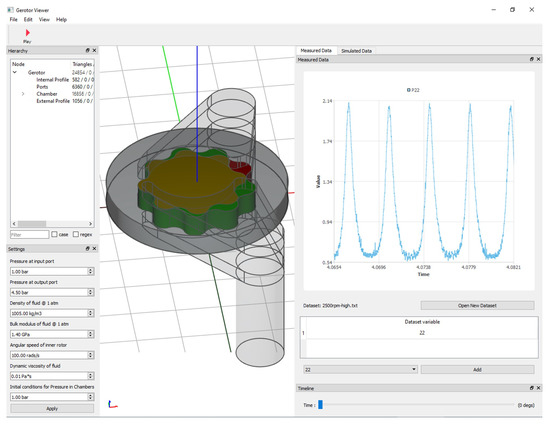 Figure 12 shows the interface that is devised for the toolkit that was introduced in [19,20] to enable the virtual prototype. The interface is built with Qt™ library and it comprises several panels: (i) the 3D visualization panel, which allows for the visualization of the pump geometry (gears, ports, and chambers) and the animation showing the rotation of the pump through a pumping cycle, (ii) a hierarchy panel that shows the hierarchy tree of the geometric model and allows the user to select and highlight geometric entities, (iii) a settings panel in which the user inputs the fluid properties, operating conditions, and initial pressure conditions that are necessary to perform the fast pre-CFD simulation (see Figure 2), (iv) a simulated data panel that displays the results from the fast simulation model, and (v) a measured data panel that displays the results of the variables that are imported to the virtual prototype tool, whether measured in the test bench or simulated by the CFD software.
