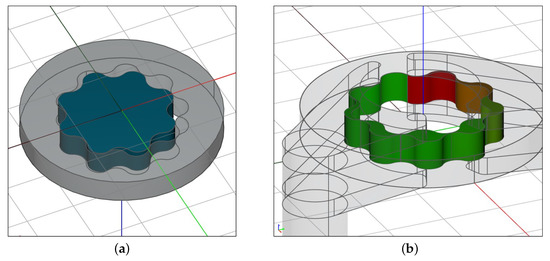 Geometry visualization: (a) inner and outer gear of the pump, (b) fluid chambers with transparent ports.