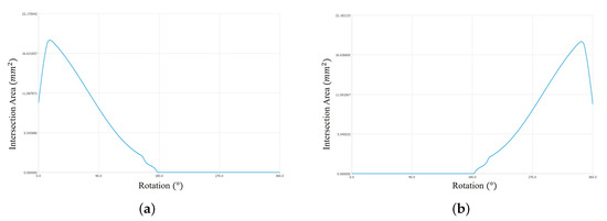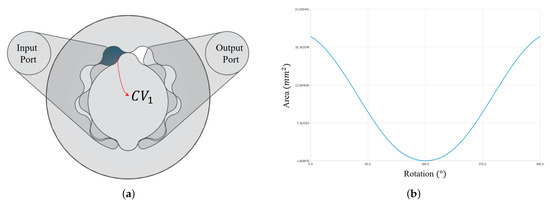 Volumetric data results from the virtual prototype: (a) history of intersection area between chamber and input port and (b) history of intersection area between chamber and output port.