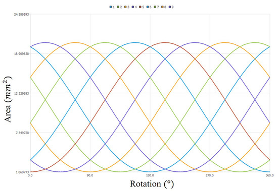 Figure 15a shows the selected analysis chamber. In this case, we have selected the maximum volume chamber when the pump is at initial position , even though our tool can perform the geometric analysis of all chambers simultaneously. Figure 15b shows the area evolution for the analysis chamber. Notice that it starts with the maximum value and diminishes until it reaches the minimum value for chamber area around halfway through a revolution. The minimum value for the area is not exactly zero because of the gaps in the meshing between the internal and external rotors described in the previous section. The area then rises until it reaches the maximum value once the revolution of the pump is completed. Figure 16a shows the intersection area between the analysis chamber and the input port (area through which the working fluid enters the pump). Notice that the intersection area increases at first, because, at initial position, the port and the chamber are only partially overlapped (as seen in Figure 15a). When the chamber is no longer overlapping with the input port and has started discharging fluid (overlapping with the output port), the intersection area with the input port becomes zero. The same analysis corresponds to the intersection area between the chamber and output port shown in Figure 16b. Figure 17 shows the history of areas for all chambers in the pump; the periodicity is explained by the cyclic design of the pump.