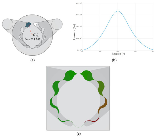 Pressure results from virtual prototype: (a) profile of geometry with highlighted chamber , (b) history of pressure in chamber , and (c) pressure distribution in pump after a full revolution, as seen in Digital Twin (DT).