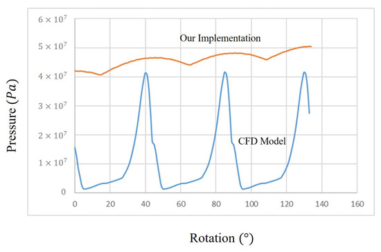 Figure 18c shows the pressure distribution in pump after a full revolution. Notice that there is a peak in pressure in the chambers near the minimum volume position and the pressure starts decreasing after the chamber intersects with the output port and goes through the discharge cycle. The discretization that was used in our virtual prototype allows for the tracking of the history of pressure for each individual chamber. However, the discretization used in the CFD methods make it impossible to track the history of pressure for an individual chamber. This is because, in CFD, the entire discretization (mesh) is updated in every time step (remeshing) to meet convergence requirements [21]. Therefore, for the purposes of comparison against a benchmark (i.e., CFD data), we use the maximal pressure across the entire fluid domain (all chambers). The CFD simulations are currently used in most of the design processes as an accurate prediction of the pump’s performance. Therefore, they are a valid point of comparison for our implementation. Figure 19 shows the results of maximum pressure in pump, as predicted by both CFD simulation and by our implementation.