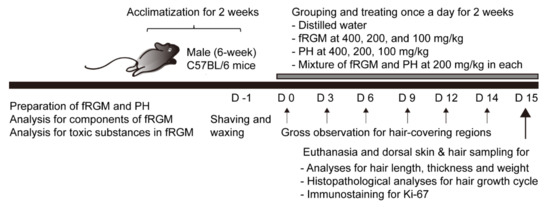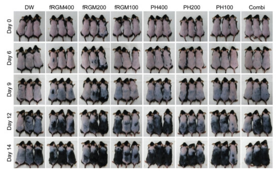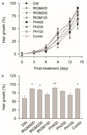 The dorsal skin hairs of mice were shaved completely using an electric clipper and a hair waxing cream containing 80% thioglycolic acid (NiCleanTM, Ildong Pharmaceutical Co., Seoul, Korea) for inducing anagen synchronization, as described elsewhere [28,29,30]. The next day, a total of 48 mice was divided into eight groups (n = 6 per group) based on their body weights; a control group with DW as a vehicle (DW), six treatment groups with fRGM (fRGM400, fRGM200 and fRGM100) or PH (PH400, PH200 and PH100) at three different doses of 400, 200 and 100 mg/kg in DW. One group was for a combination group with fRGM and PH at 200 mg/kg in each (combi). Treatments were topically applied on the dorsal-hair-removed area of approximately 3 × 5 cm2 in a volume of 200 μL per mouse, once a day for 2 weeks.